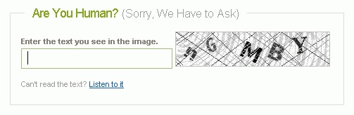 A CAPTCHA or Completely Automated Public Turing test to tell Computers and Humans Apart.  Captcha is a type of challenge/response test used in com  puting to ensure that the response is not generated by a computer.  You may know it from those deliberately distorted or occluded images you see when signing up for online services.  Because other computers are unable to solve the CAPTCHA, any user entering a correct solution is presumed to be human. Thus, it is sometimes described as a reverse-Turing test because it is administered by a machine and targeted to a human, in contrast to the standard Turing test that is typically administered by a human and targeted to a machine.  There is an irony in humans using computers to create a test that distinguishes humans from computers.