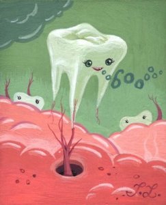 After the operation I asked for my teeth back.  They told me that I could not have them because they were now a BIO-HAZARD.  “At least let me say goodbye to them… to my babies.”  They consented and brought me to the recovery lounge.  The nurse came in with an extended arm and opened her hand, palm up.  There they were, exposed to the open air:  five half-rotted teeth laying in a pool of blood on her cold, rubber glove.   And observing the teeth for the first time without possession and function, I appreciated them for what they truly were:  five overturned tombstones from a graveyard.  “Now that the gums are unplugged, the souls are bound to escape,” I told the nurse, but she seemed nonplussed.  It was probably too late, anyway.  The ghosts and demons once held at bay by those ivory monuments were now free to roam the far reaches of Earth and pursue their dark, inhuman desires.  “You fools,” I shouted as I was discretely escorted from the premises.  They were all doomed, but I didn’t care.  They had unleashed their own destruction, and there was no escape.  So be it.  Good luck and Godspeed, my babies… Godspeed.